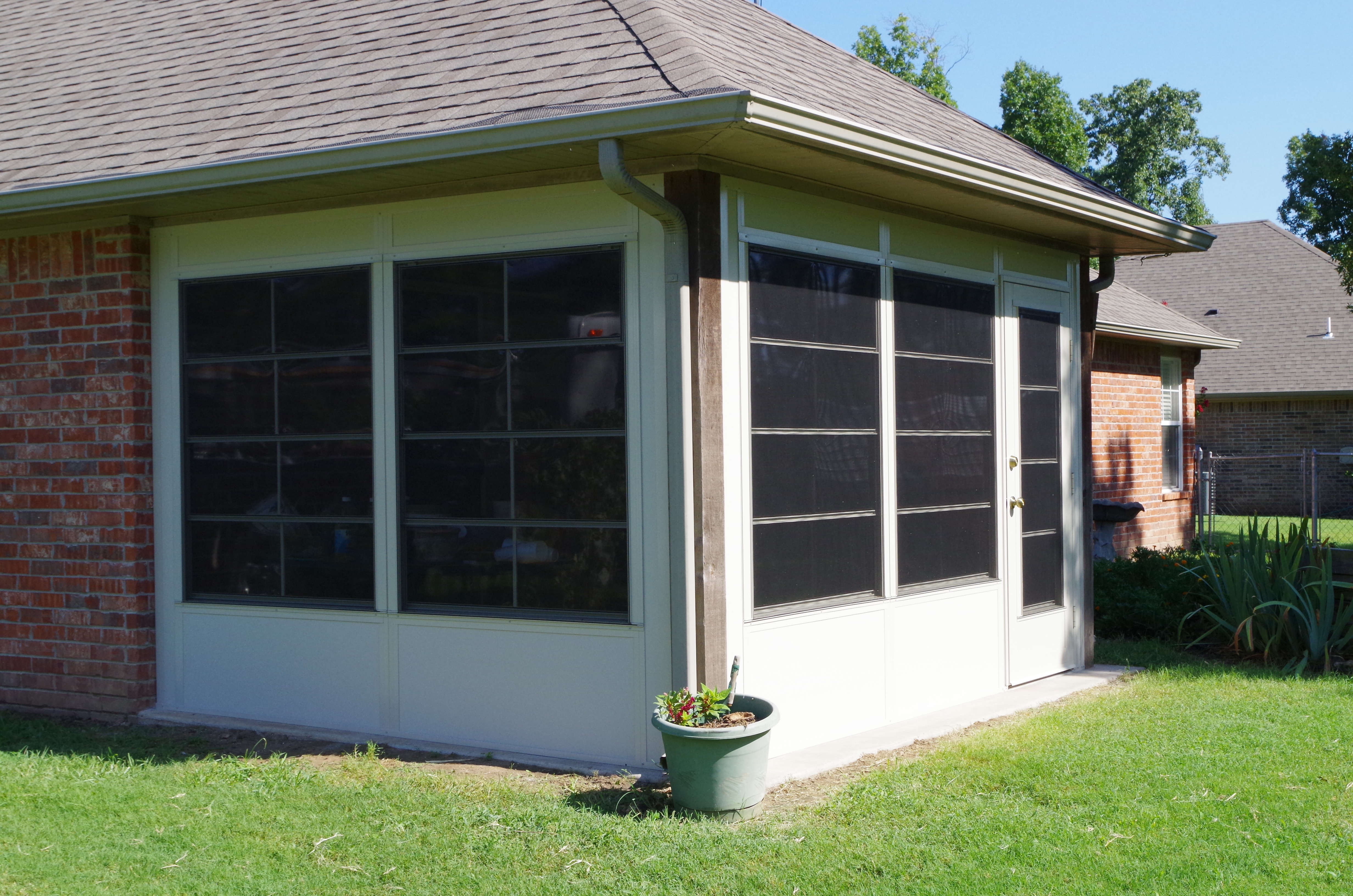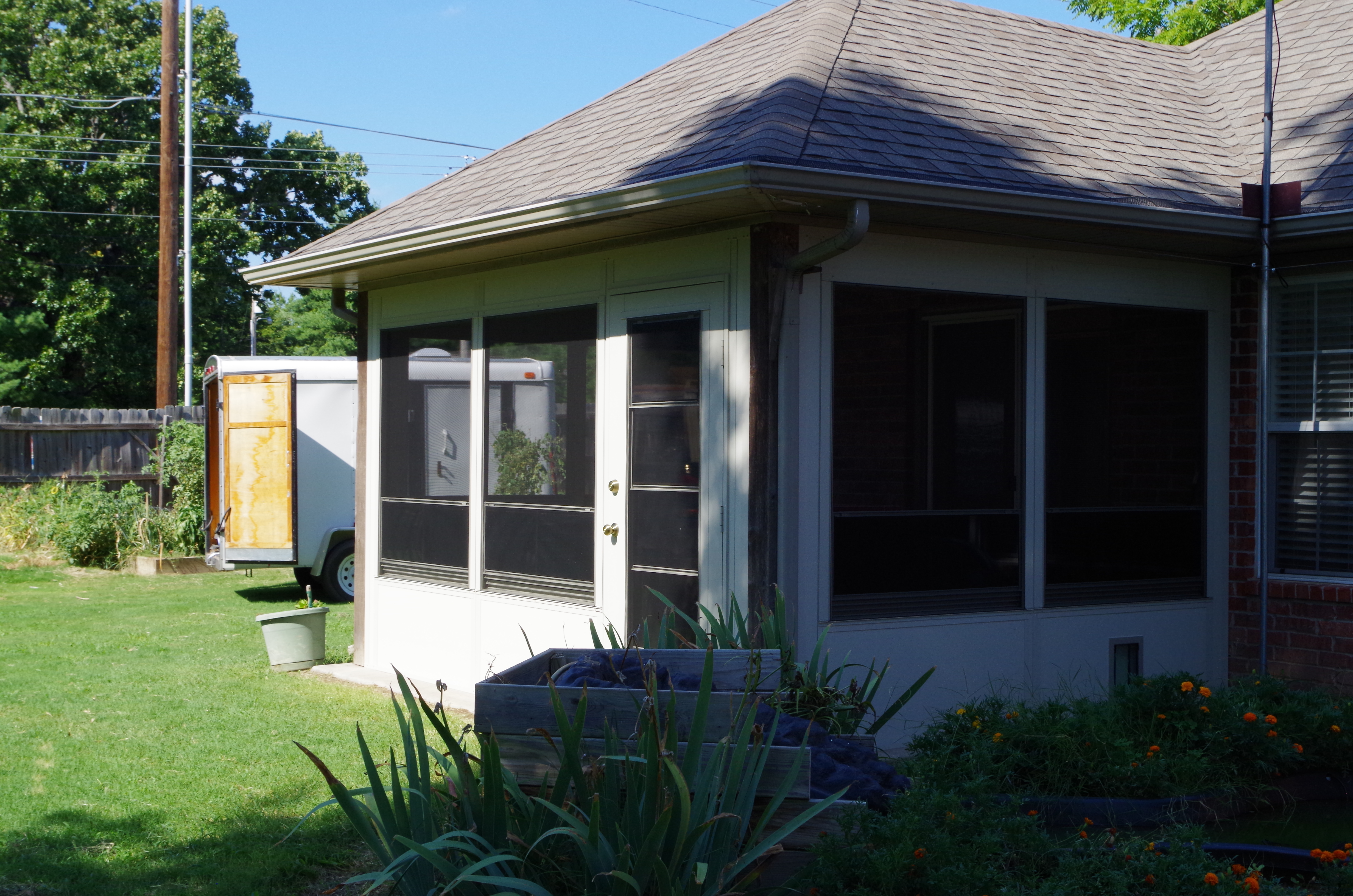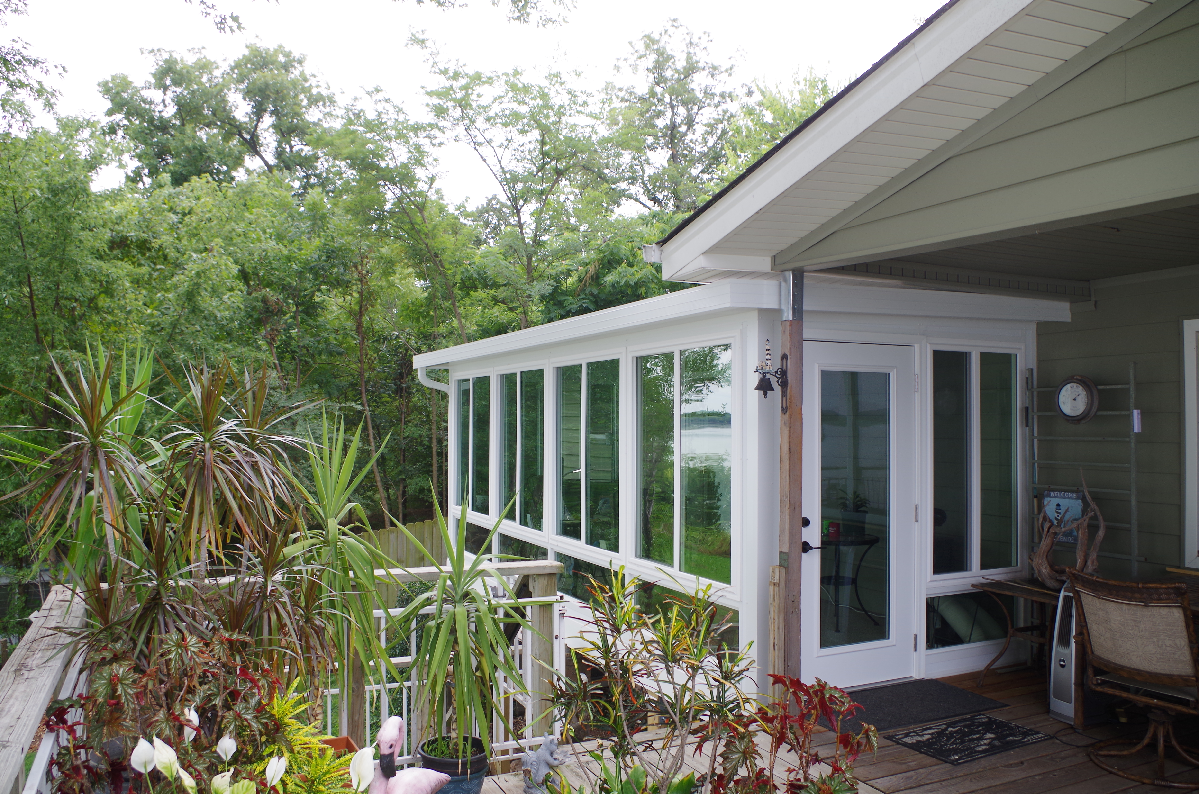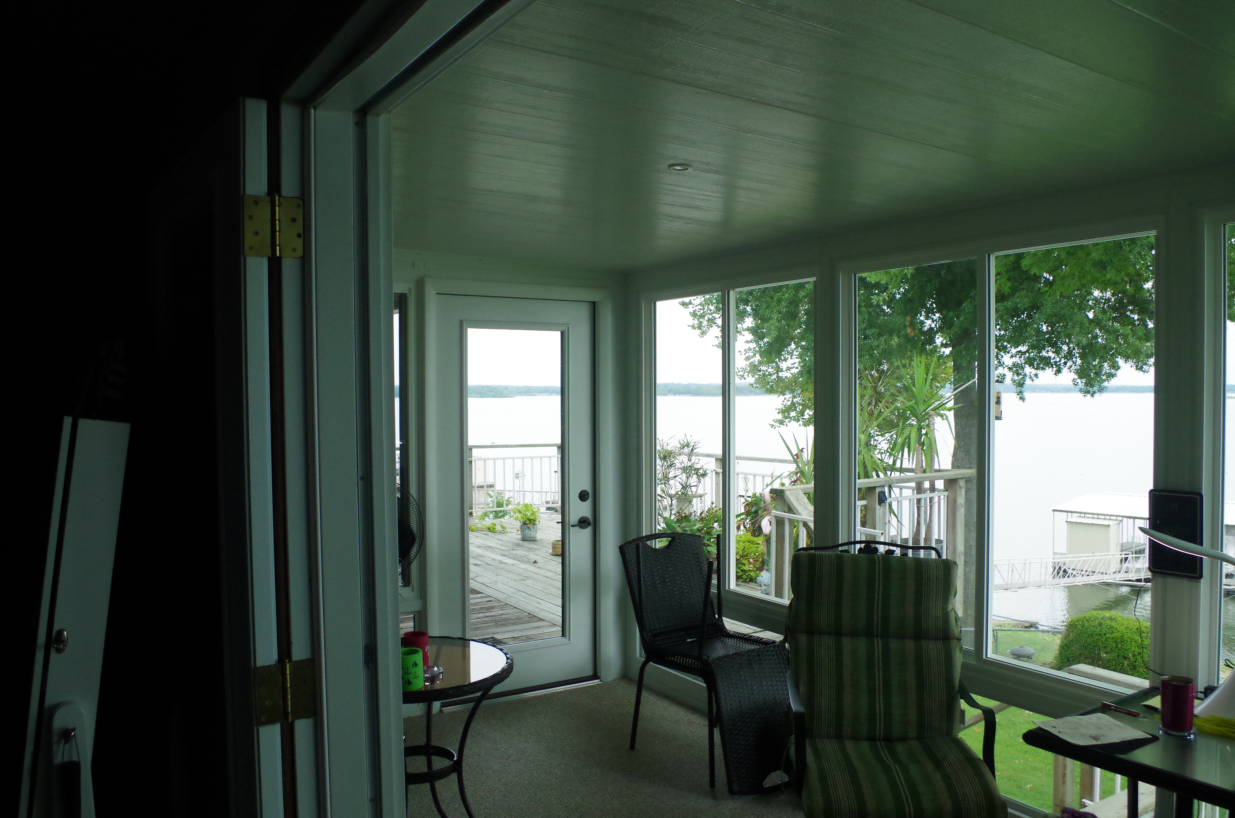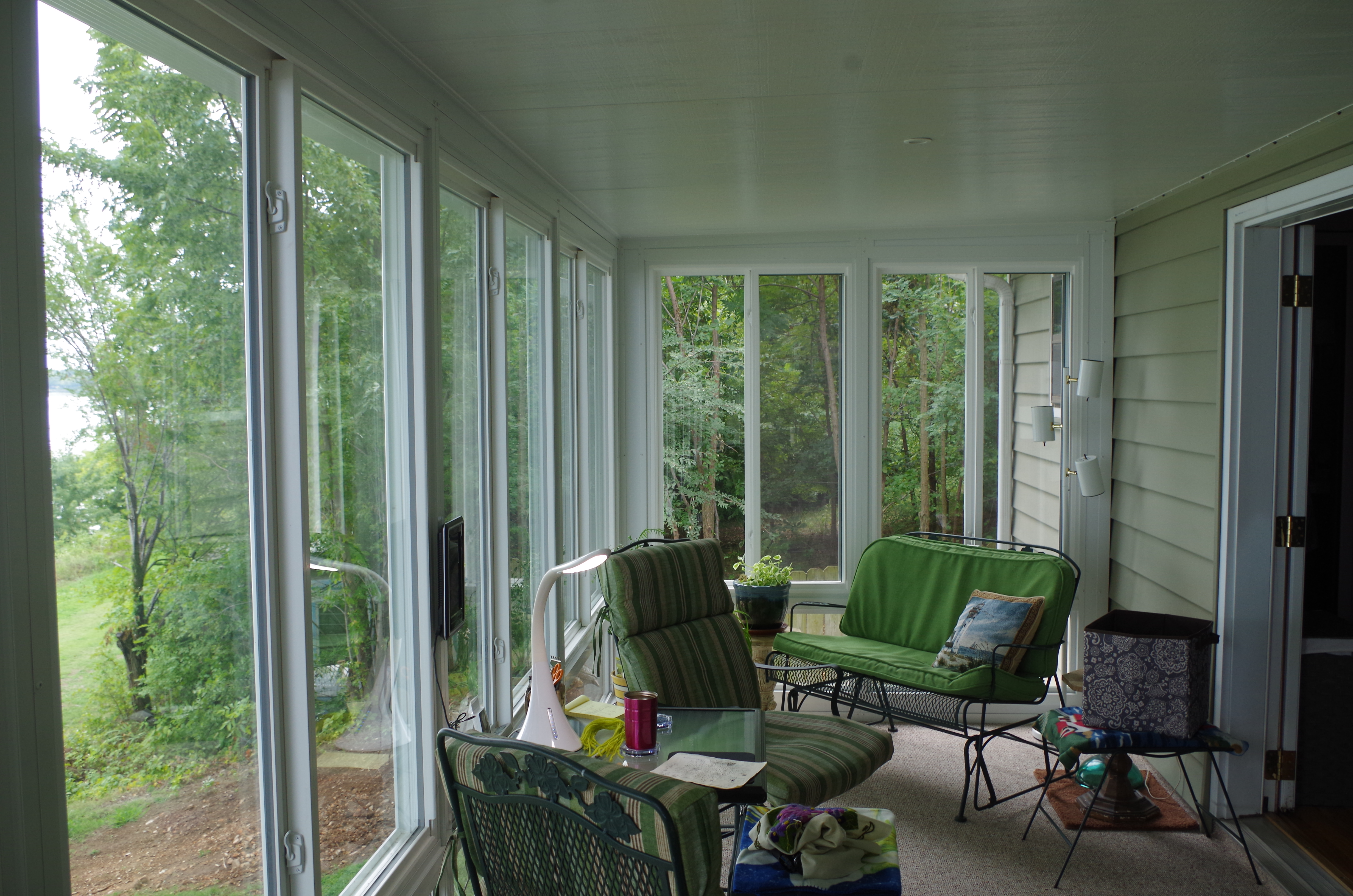 This room is approximately 10 ft X 12 ft and has a walk out door (pictured). The windows are the vinyl-glazed 4 track style, with factory tinting. It was installed on a porch with an existing concrete slab floor in less than 2 days.